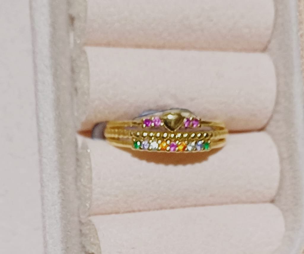 Anel três fileiras com zircônias coloridas e coraçãozinhos banhado a ouro. Romântico, elegante e cheio de brilho.