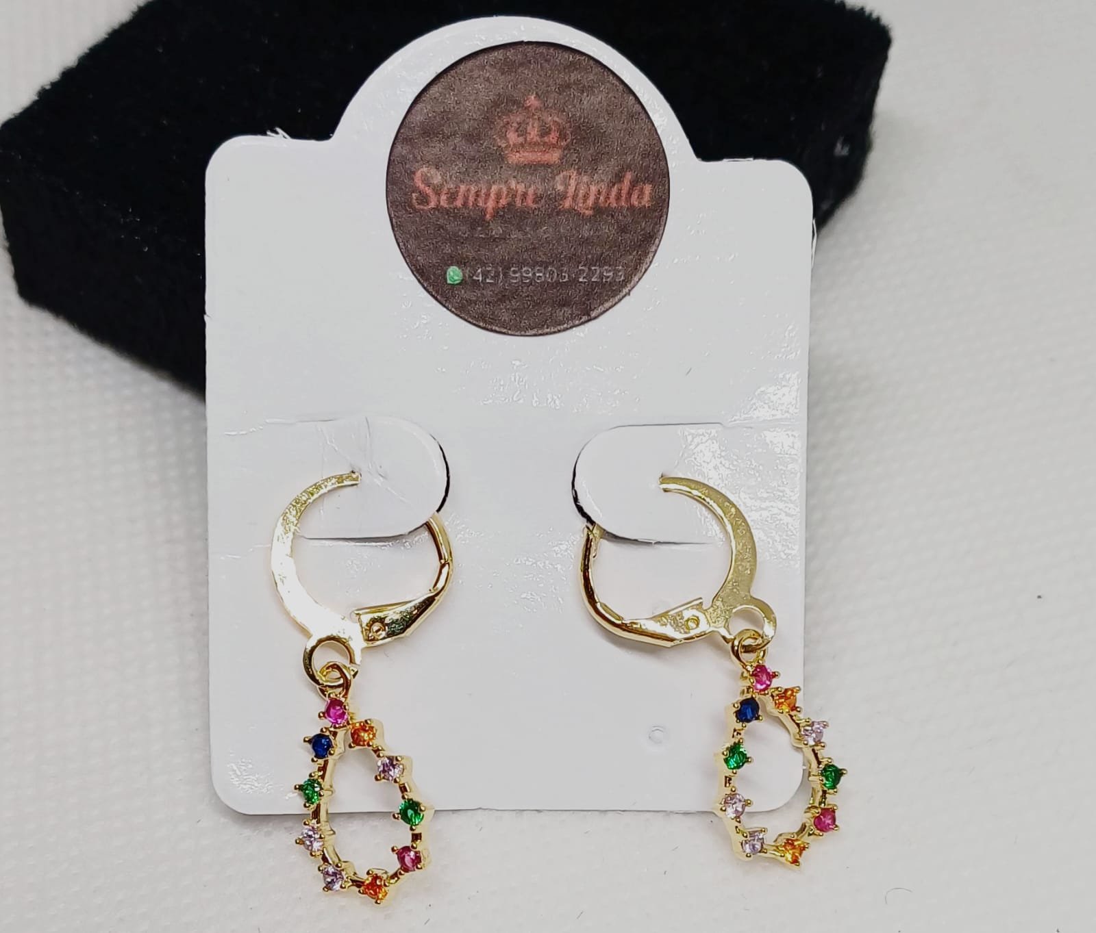 Argola click em gota vazada com micro zircônias coloridas banhado a ouro