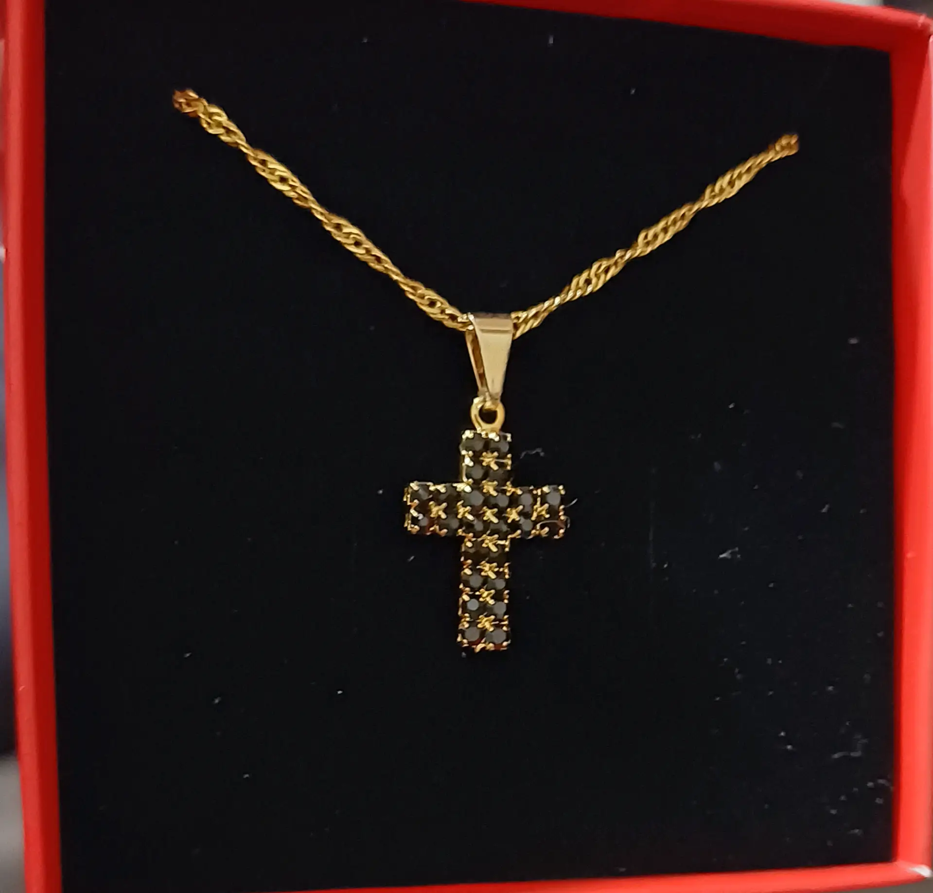 Colar veneziana com pingente cruz com zircônias preta pequena banhado a ouro