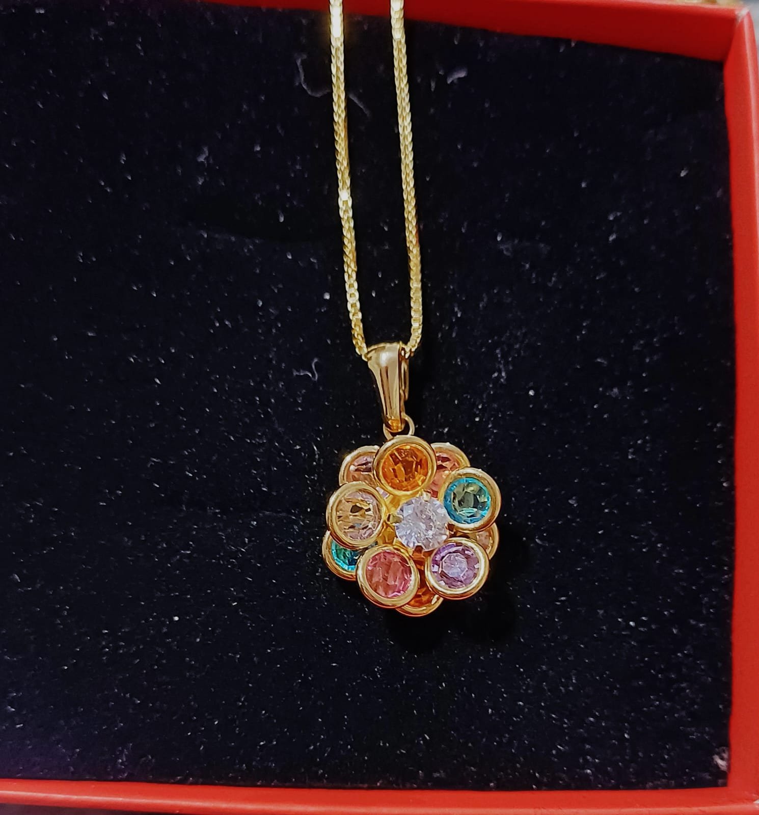 Colar veneziana com pinegente flor com pétalas coloridas zircônias banhado a ouro