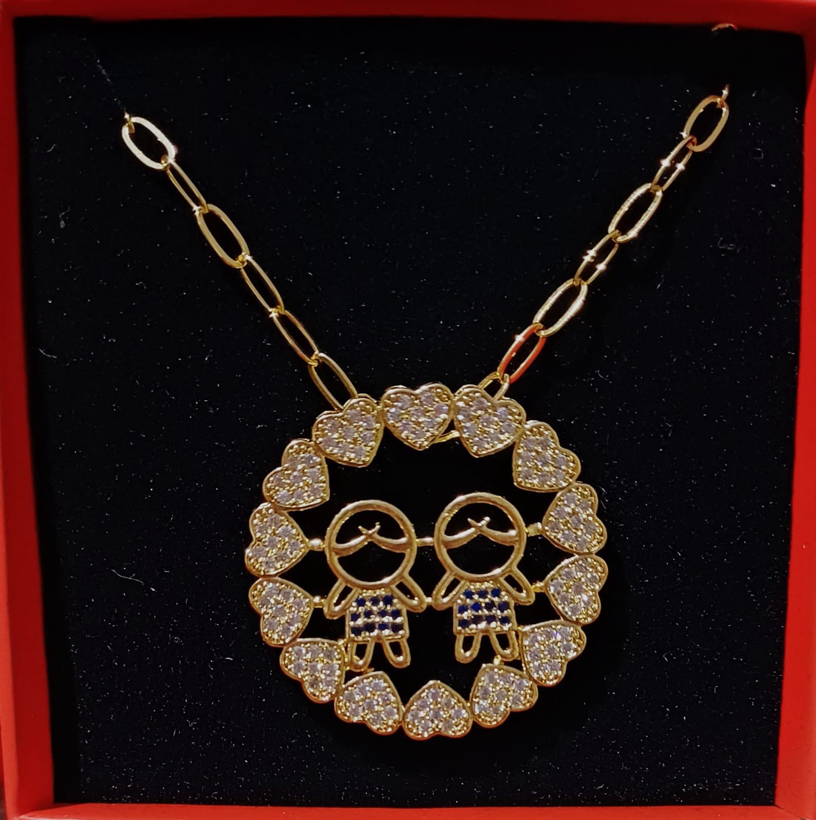 Colar em elos com mandala 2 meninos com zircônias azuis e em volta corações com micro zircônias banhado a ouro