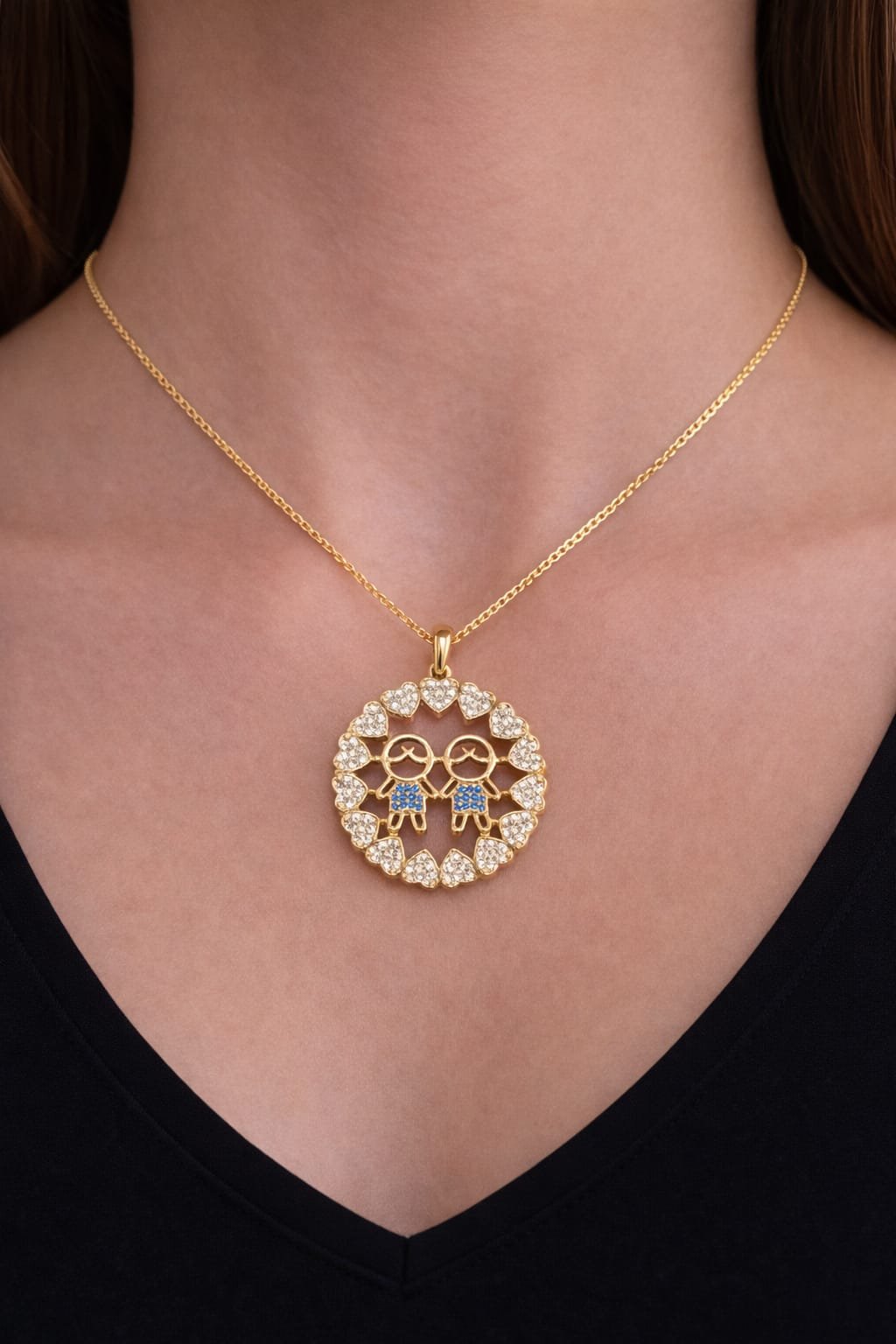 O colar mandala com 2 filhos em zircônias azuis, rodeado por corações cravejados, é um colar delicado que representa o amor infinito de mãe. Perfeito como presente para mãe, ele é um mimo especial cheio de significado, ideal para eternizar esse vínculo único ou surpreender com uma surpresa afetuosa que emociona de verdade.