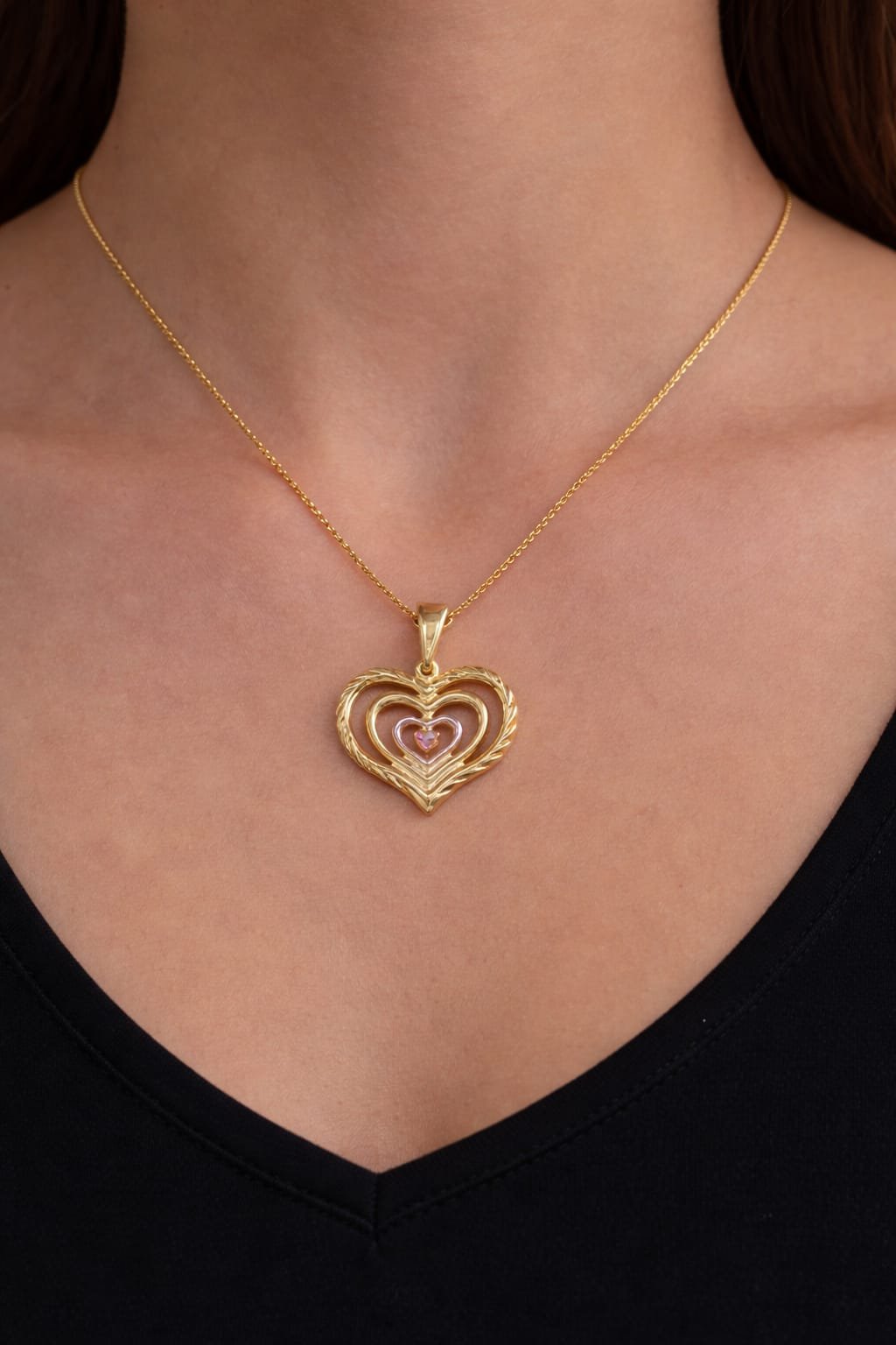 Colar coração contornado com 3 cores de banho: ouro, prata e bronze. Um presente feminino delicado, versátil e cheio de significado.