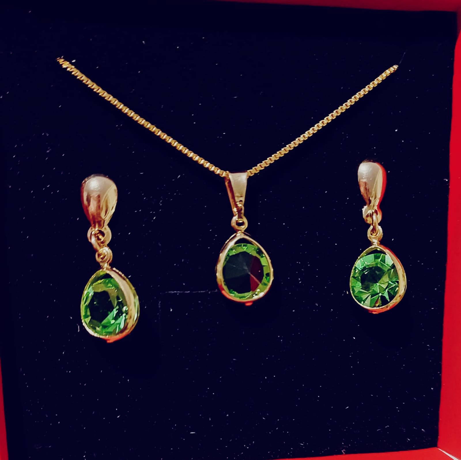 Conjunto brincos e colar veneziana com pingente gota verde cristal zircônias banhado a ouro