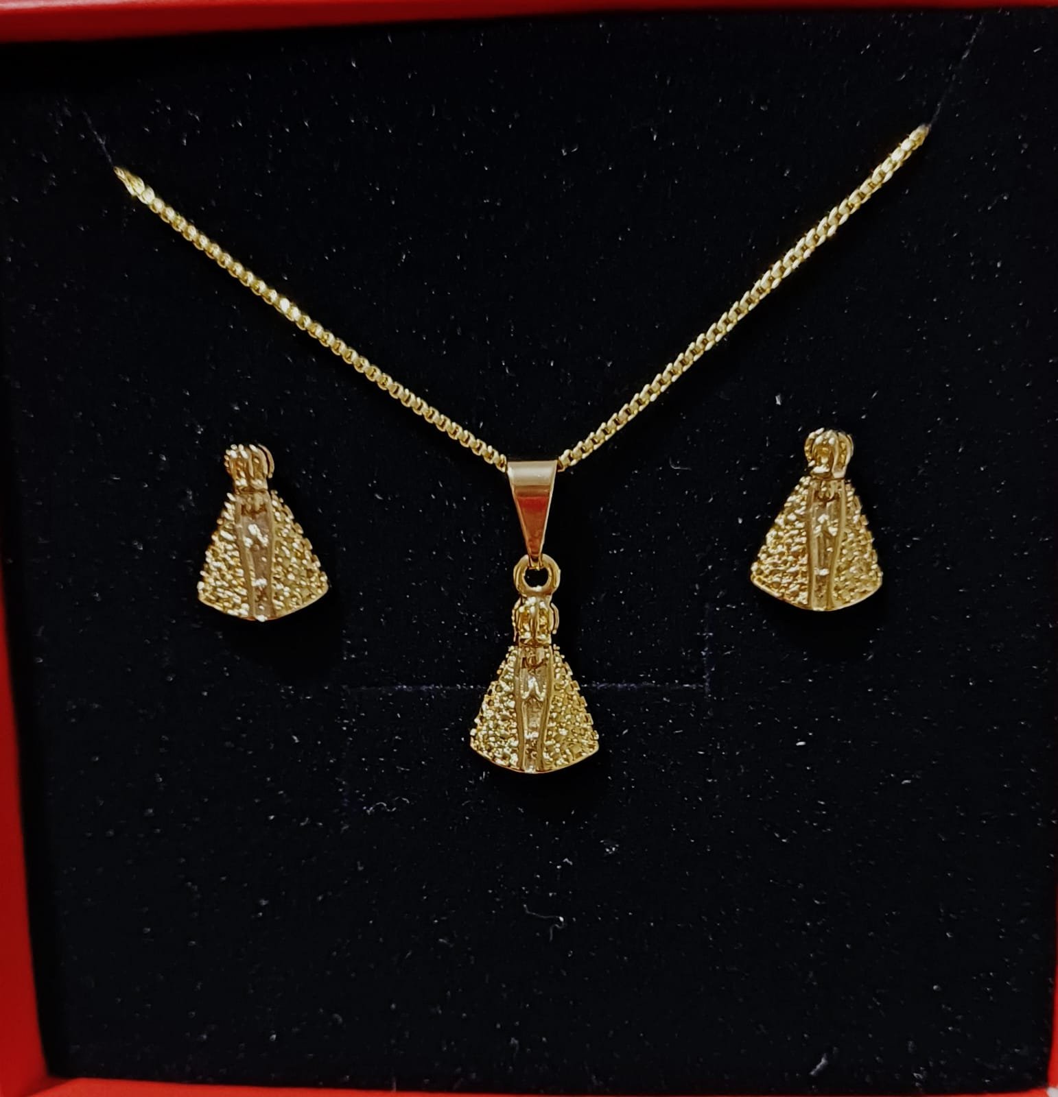 O colar e os brincos possuem design detalhado e sofisticado, valorizando a imagem sagrada de maneira leve e feminina. É uma peça que transmite paz, devoção e beleza — perfeita para mulheres que gostam de acessórios significativos, seja para uso diário ou para ocasiões especiais.