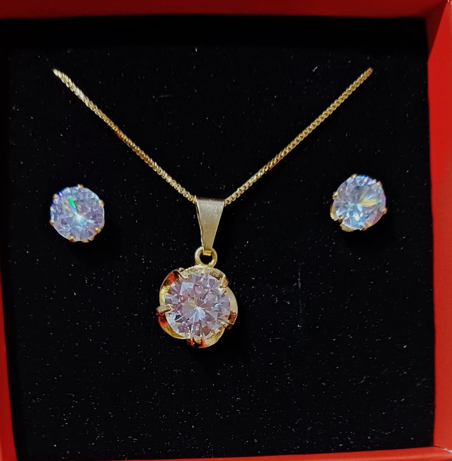 Conjunto brincos e colar veneziana com pingente ponto de luz zircônias grande banhado a ouro