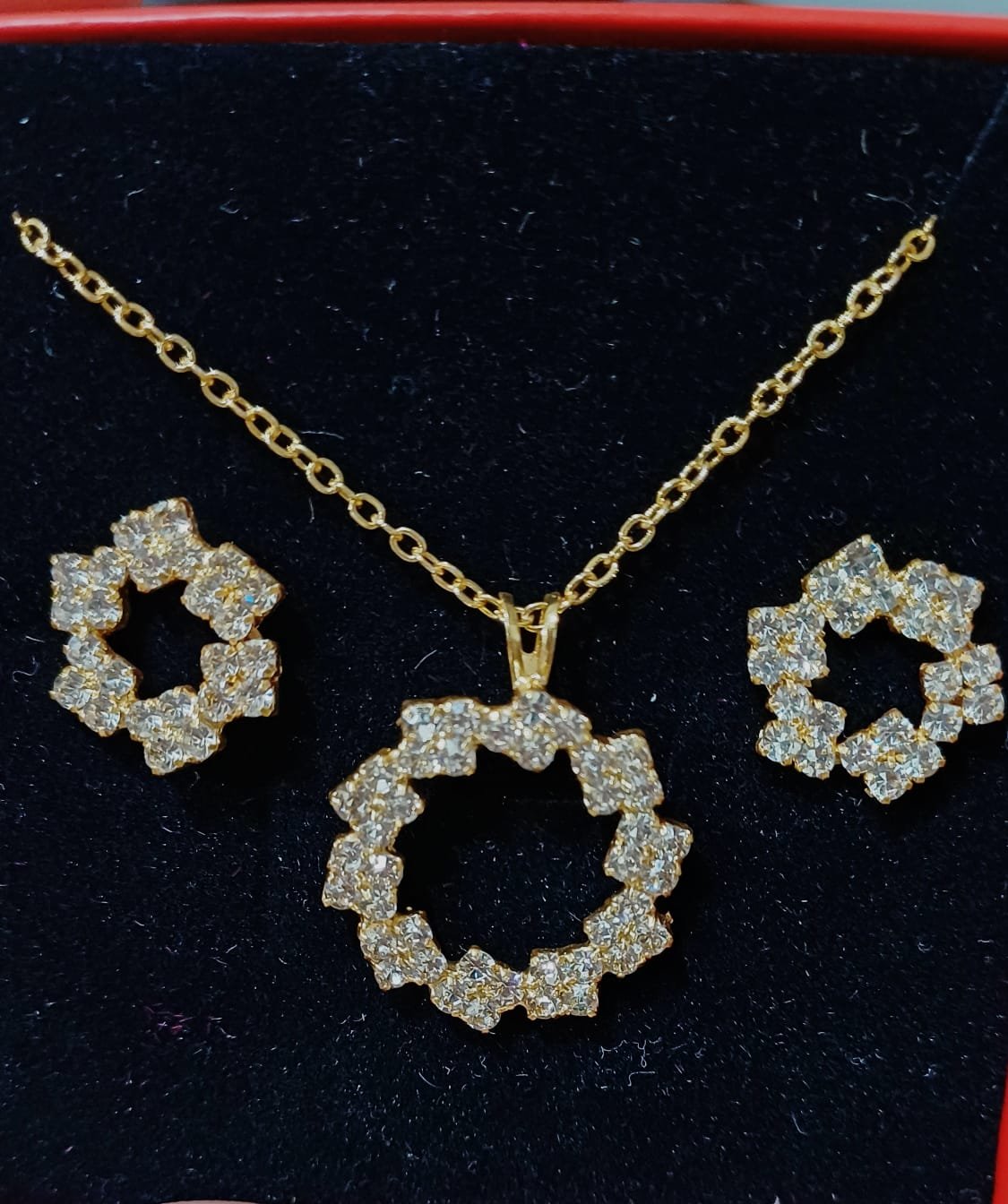 Conjunto brincos e colar com pingente quadradinhos cravejado de Zirconias banhado a ouro