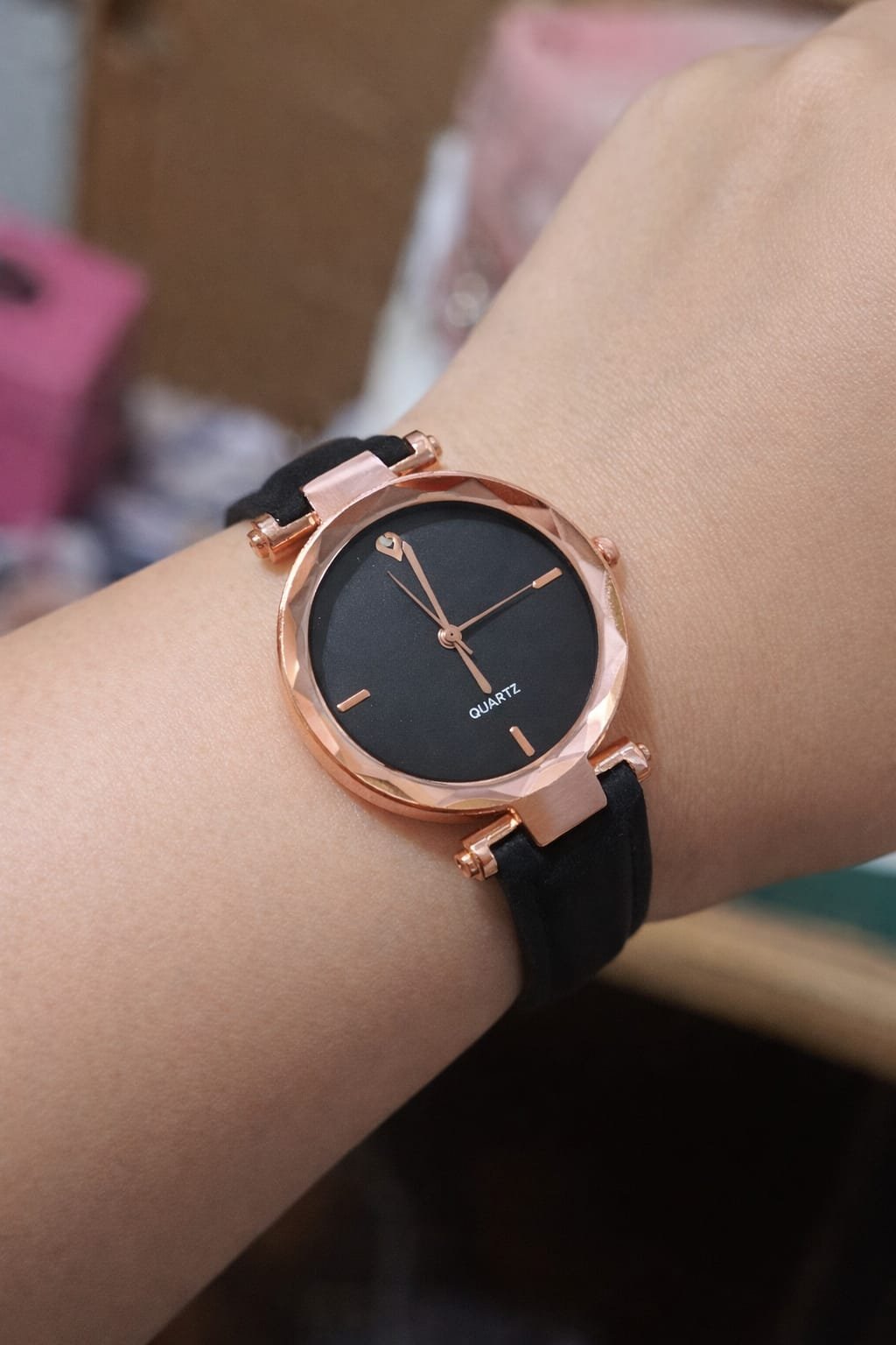 O relógio com fundo preto e pulseira em couro dourado rosé é a escolha perfeita para quem busca elegância com personalidade. Um acessório moderno e atemporal, ideal como presente feminino elegante para mãe, amiga ou para você mesma. Um mimo especial que transforma qualquer momento em uma surpresa afetuosa cheia de estilo.